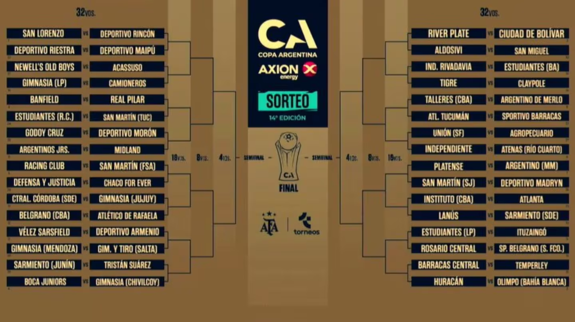 Por su parte, Racing enfrentará a San Martín de Formosa, mientras que Independiente se cruzará con Atenas de Río Cuarto. San Lorenzo tendrá un cruce con Deportivo Rincón de Neuquén, mientras que Huracán lo hará ante Olimpo de Bahía Blanca.